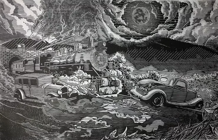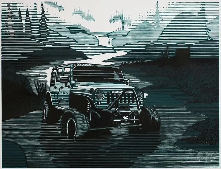 What I do now, because I am trying to cut down on time and how long it all takes me. I’ll compose my thoughts, write them all down, once I have a better idea of what it looks like in my head, I will put it on the computer and move things around, see if they work, make a bunch of different thumbnails. From there I’ll have my photo references all put together. I’ll put the basic things I need, say a female figure or a car. Then I take that and hand draw it to my woodblock and add all the different elements that I really didn’t need to throw in on the computer.