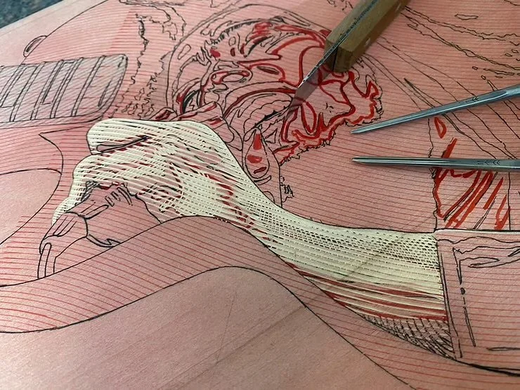 So, starting a piece for me is always on my head, then onto paper as notes, then I will draft something on the computer, followed by hand drafting on my woodblock, and after that going back to tonal values. I will separate tonal values, typically I used 4-5 in a piece, but how I do them they look like more. They often transition into each other. I will basically separate them as a paint-by-number, so that it makes my line work easier to think out as I’m carving it because some parts need to be lighter. It’s a roadmap to finishing a piece. That’s basically it, after the carving comes the easy part!