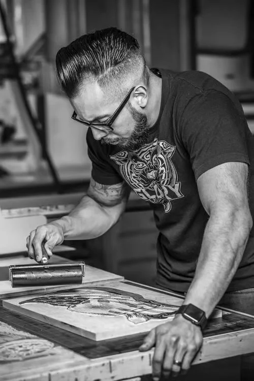 Let’s see, I am 34 and started when I was 19. I learned it in college, and I have been doing it ever since. I took like an intro to printmaking class, where we did collagraphs and I hated that! I could not get that, it was too artsy for me, it kinda reminds me of collages you know. Didn’t like that, but when we started doing linoleum and woodcuts. I was like oh man I can get on board with this. So, after I learned [linocut/woodcut] that’s all I basically did from there on now.